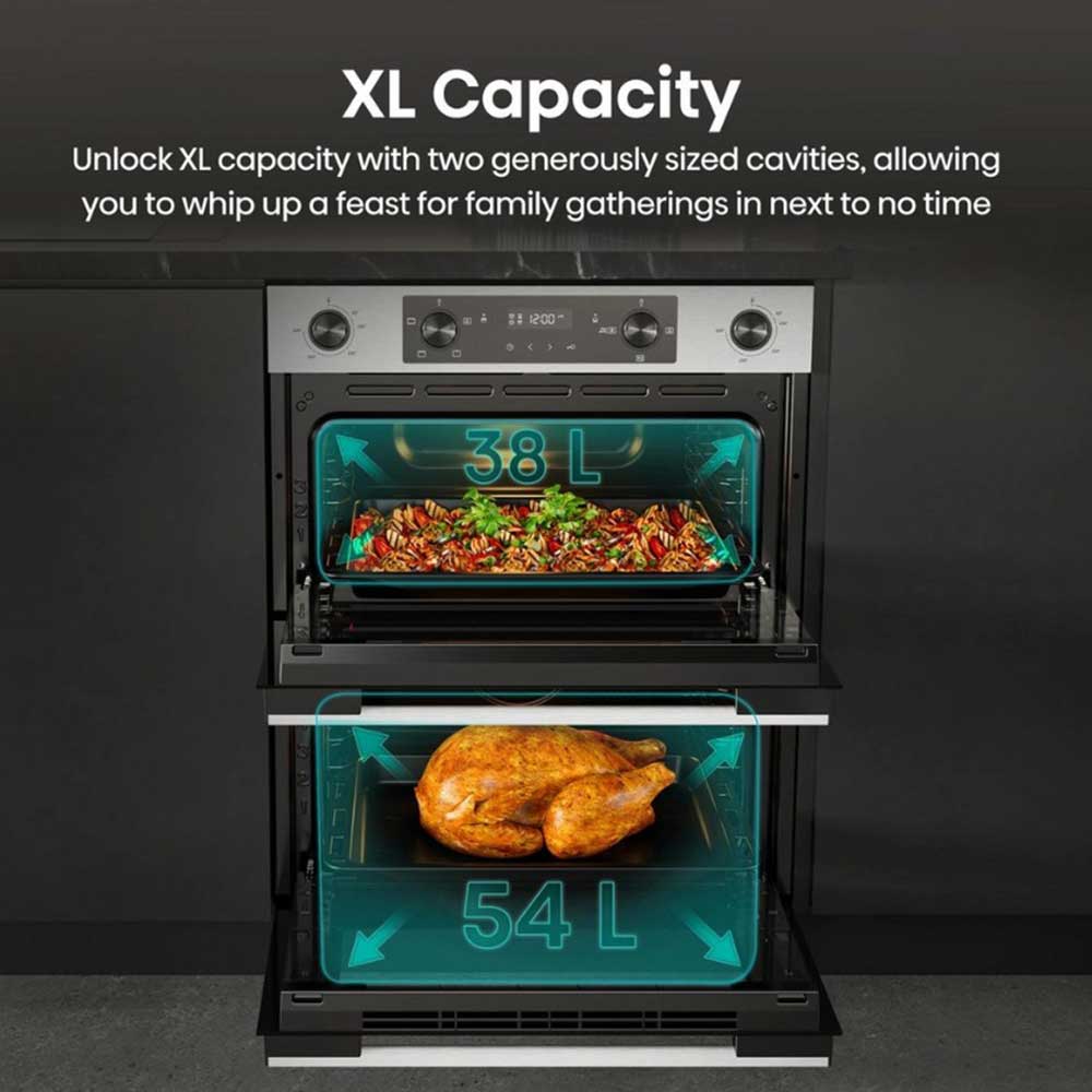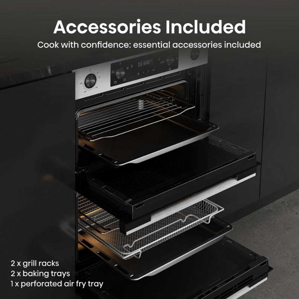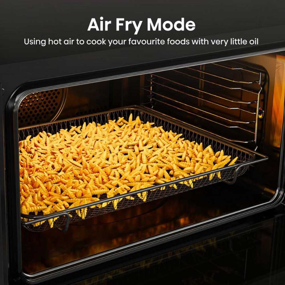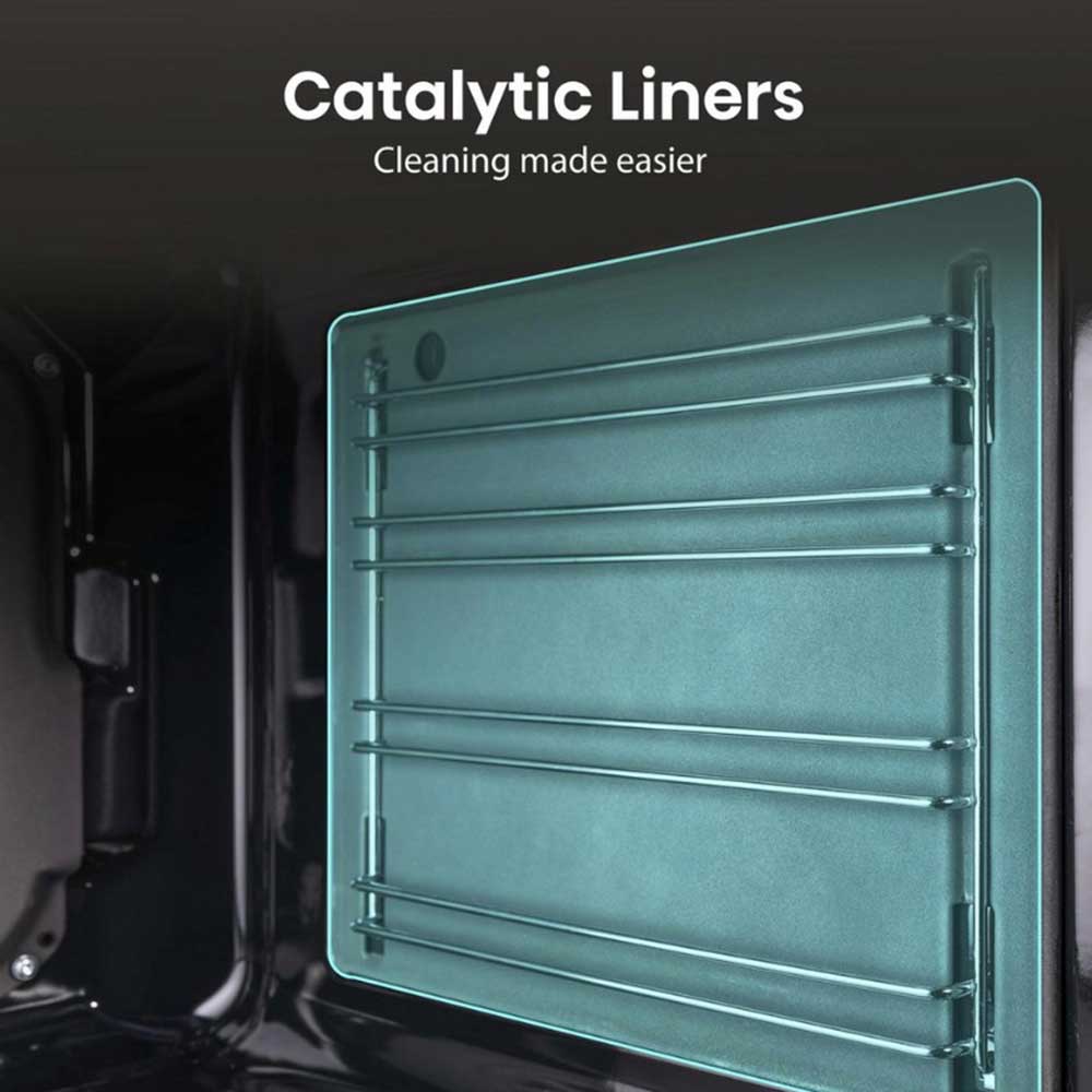 Features Main electric fan oven – Ensures even cooking on every shelf Airfry function with tray – Provides healthier frying options Special catalytic liners – Simplify oven cleaning process Large double cavity – Offers versatile cooking space