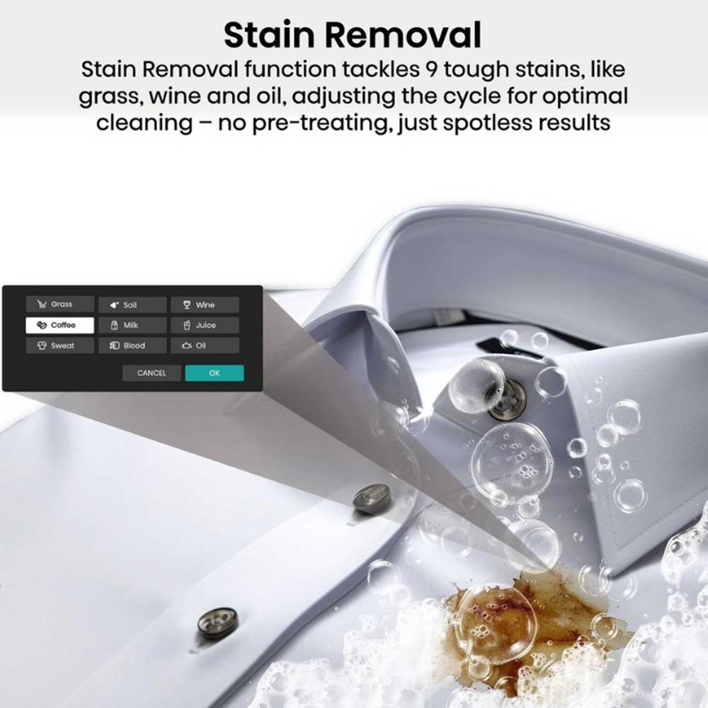 Ideal for busy households, this model includes Quick Wash Pro, offering wash cycles tailored to various load sizes—complete a full wash in under an hour or a small load in just 15 minutes. The Cold Wash function uses cold water with extended cycles to reduce energy use by up to 71%, making it an eco-friendly and cost-effective choice. Its Stain Removal feature targets nine common stains by adjusting wash parameters automatically, saving time and hassle.