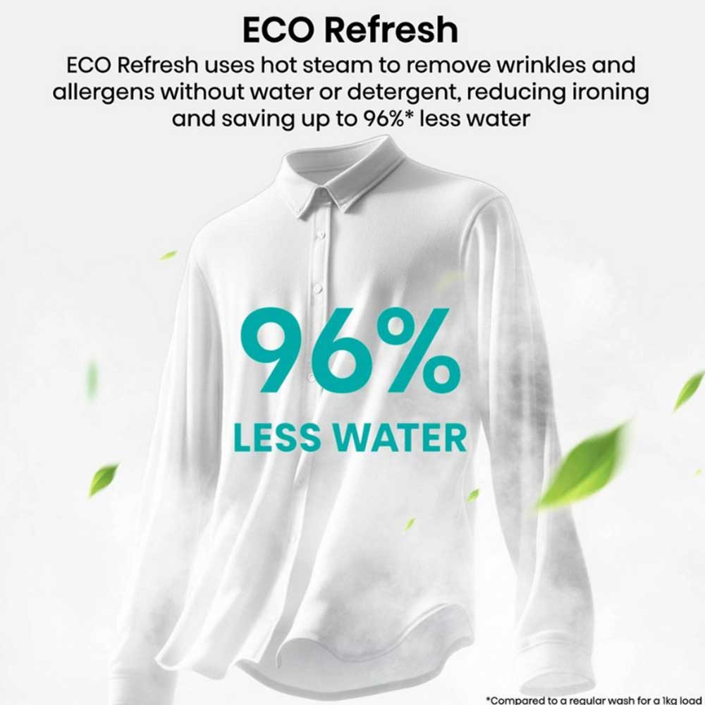 Additional Information ECO Refresh - Refresh your clothes the smart way with ECO Refresh. This innovative feature releases a powerful burst of hot steam into the drum, penetrating deep into fabric fibres to remove wrinkles and allergens – all without using water or detergent. Perfect for freshening up dry clothes, ECO Refresh reduces the need for ironing, saving you time and effort, while also using up to 96% less water compared to a regular wash for a 1kg load. Effortless, eco-friendly and incredibly effective.