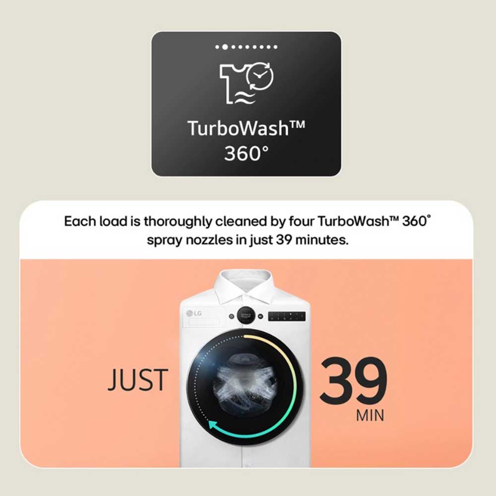 Designed for efficiency and convenience, this model features TurboWash 360 technology that cleans a 5kg load in just 39 minutes without sacrificing wash effectiveness. Equipped with LG’s advanced Steam technology, it eliminates allergens by up to 99.99%, promoting a cleaner, healthier wardrobe for families. Its user-friendly dial control and tailored wash programmes make laundry tasks straightforward and adaptable to various fabric needs.