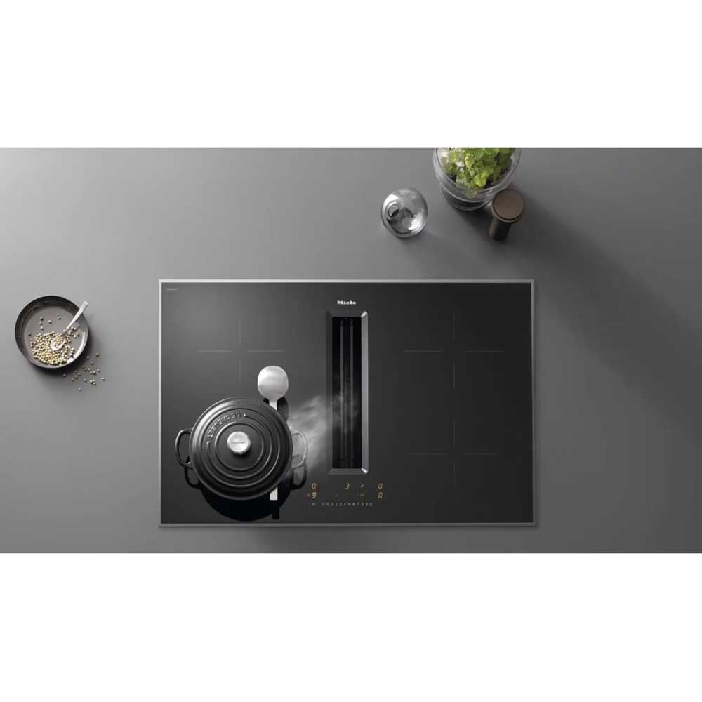 The Miele KMDA7272-1-FR combines powerful induction cooking with integrated vapour extraction, offering a sleek and practical solution for modern kitchens. Finished in elegant black ceramic glass with a stainless steel frame, the hob sits neatly within the worktop while removing the need for a traditional overhead extractor hood.