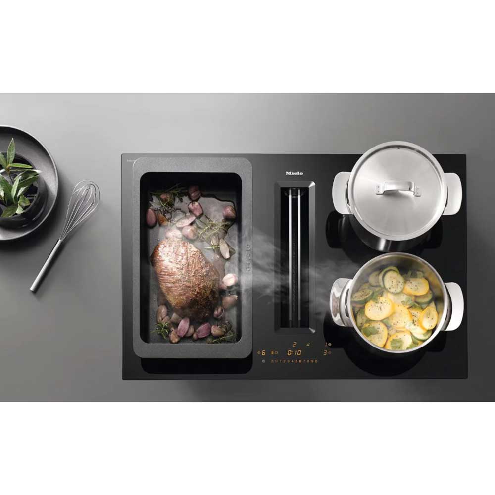 At the centre of the hob is a flush-fit extractor system that captures steam, grease and odours directly at the source before they spread around the kitchen. Powered by Miele’s advanced Silence motor, the extractor delivers strong airflow while operating noticeably quieter than many conventional ventilation systems.