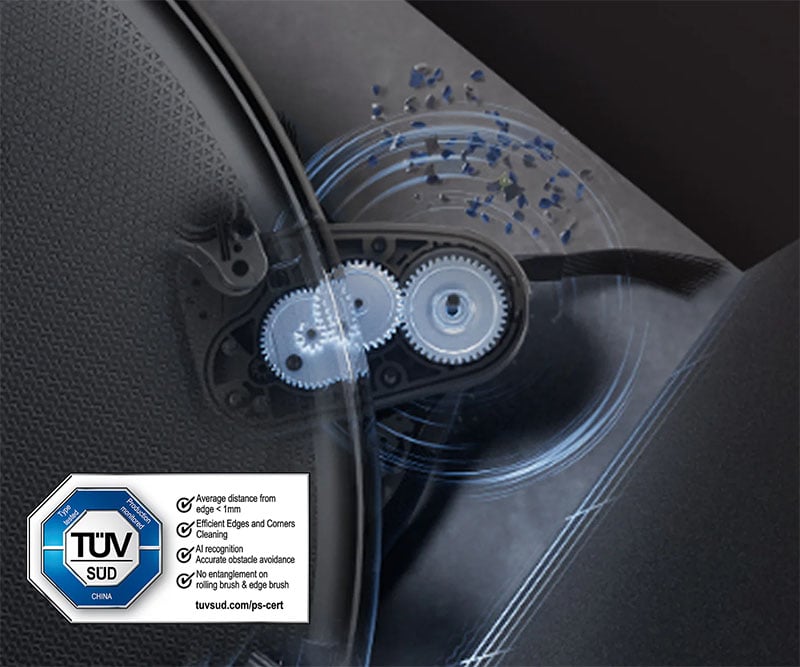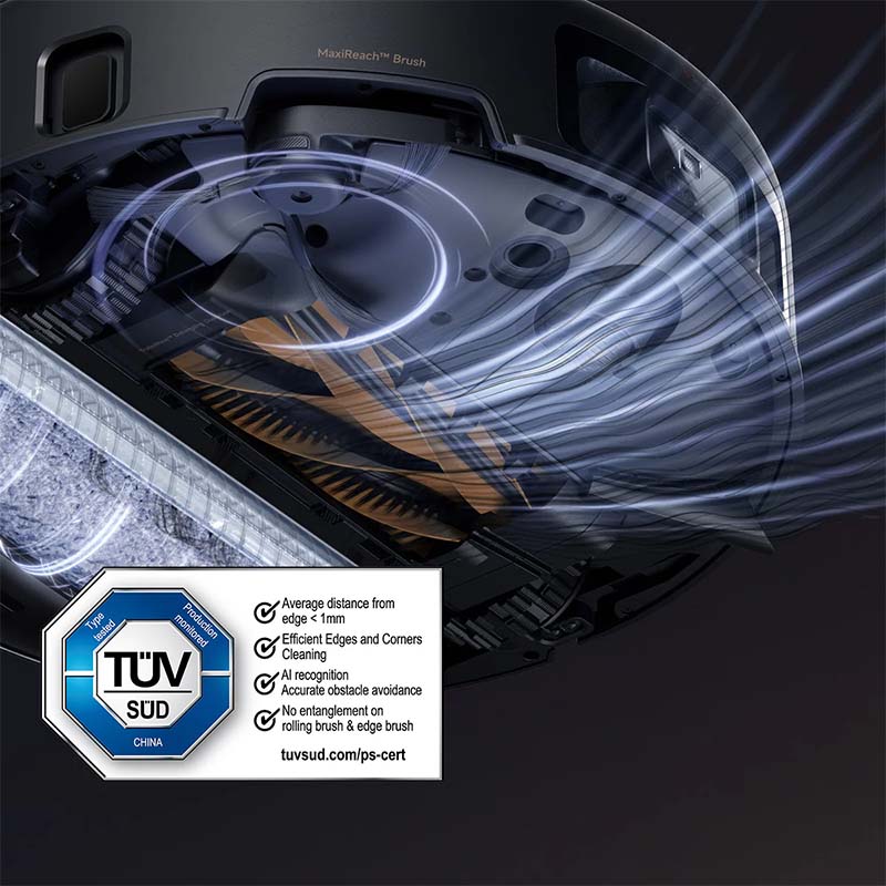 With MaxiReach™ Brush, side brush dynamically extends to sweep up dust, hair, and debris—achieving 99.99%* edge coverage