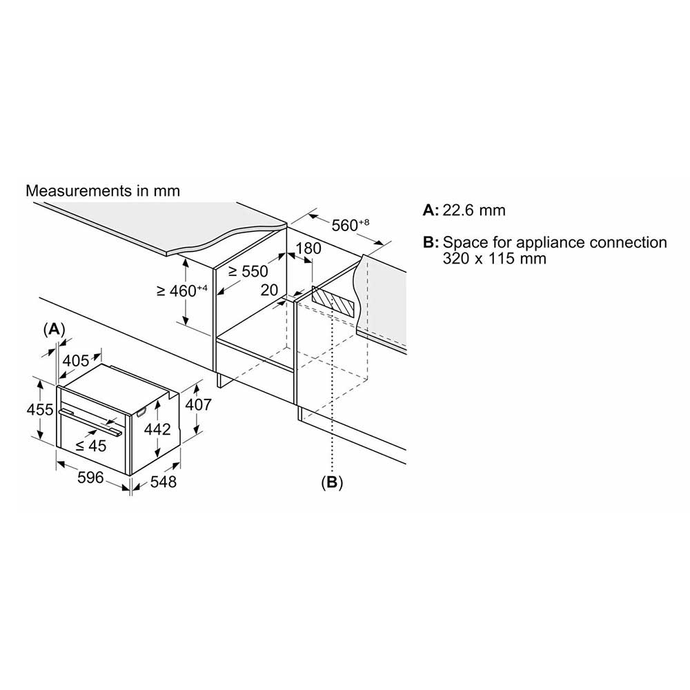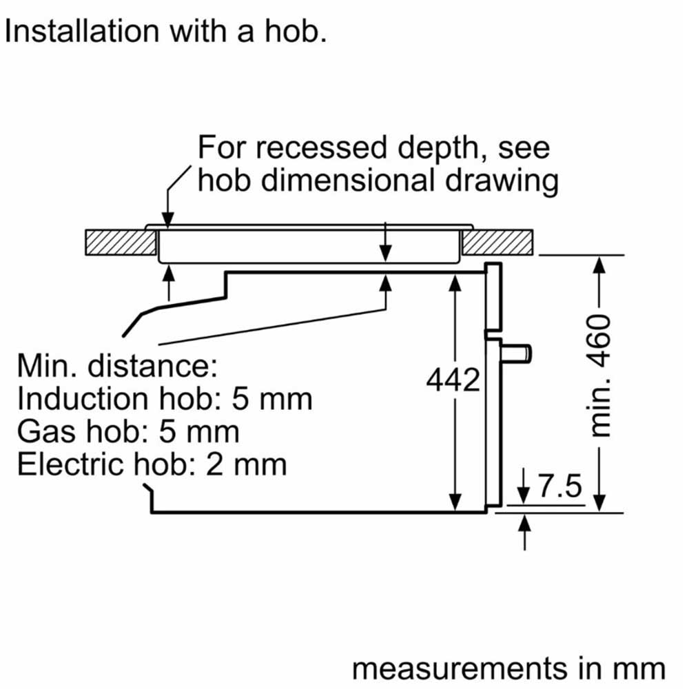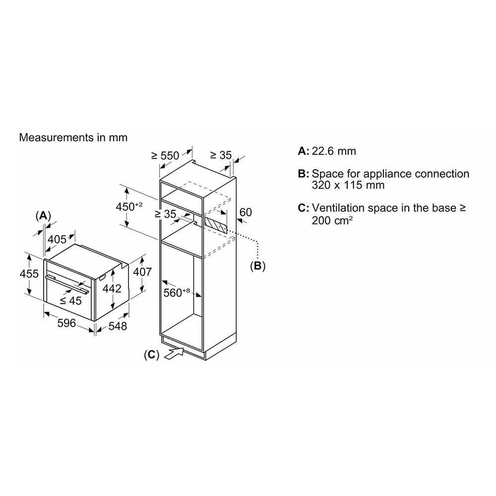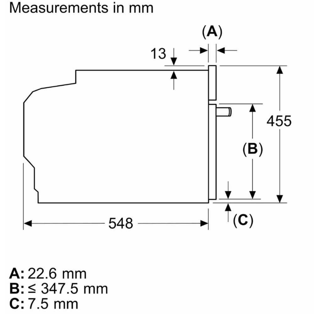 Design Flex Design Touch control With steel trim Cavity inner surface: enamel anthracite Features HomeConnect ready on WLAN Oven Assistant with Voice Control Control panel lock Automatic safety switch off Residual heat indicator Start button Door contact switch Programmes/functions Max. Power: 900 W; 5 Microwave power settings (90 W,180 W,360 W,600 W, boost) with Inverter (MW) Intelligent microwave inverter technology: For optimised results maximum output power will be regulated to 600 W when used in longer operation for gentler cooking. Temperature range 30 °C - 230 °C LED light, On/off button Electronic clock timer Drop down door, SoftClose, soft opening Heat reflective glass Triple glazed door glazed CoolTouch door Temperature proposal Actual temperature display Heating up indicator cookControl Plus No Cooling fan Stainless-steel fan Level independent telescopic rails 3 shelf positions Cleaning EasyClean Accessories 1 x combination grid, 1 x universal pan Performance/technical information Power cord length 150 cm Cable length Cavity volume: 45 litre Nominal voltage: 220 - 240 V Total connected load electric: 3.6 KW Appliance dimension (hxwxd): 455 mm x 596 mm x 548 mm Niche dimension (hxwxd): 450 mm - 455 mm x 560 mm - 568 mm x 550 mm “For-details-on-installation-and-ventilation requirements – please refer to the installation manual prior to fitting.”