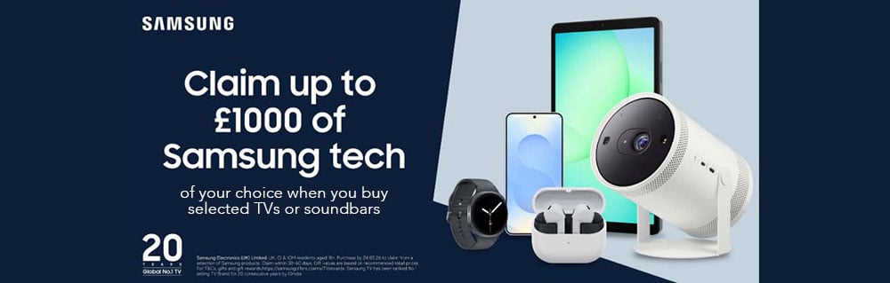 Get up to £1000 tech gift with any selected Samsung TV or Soundbar purchase.
