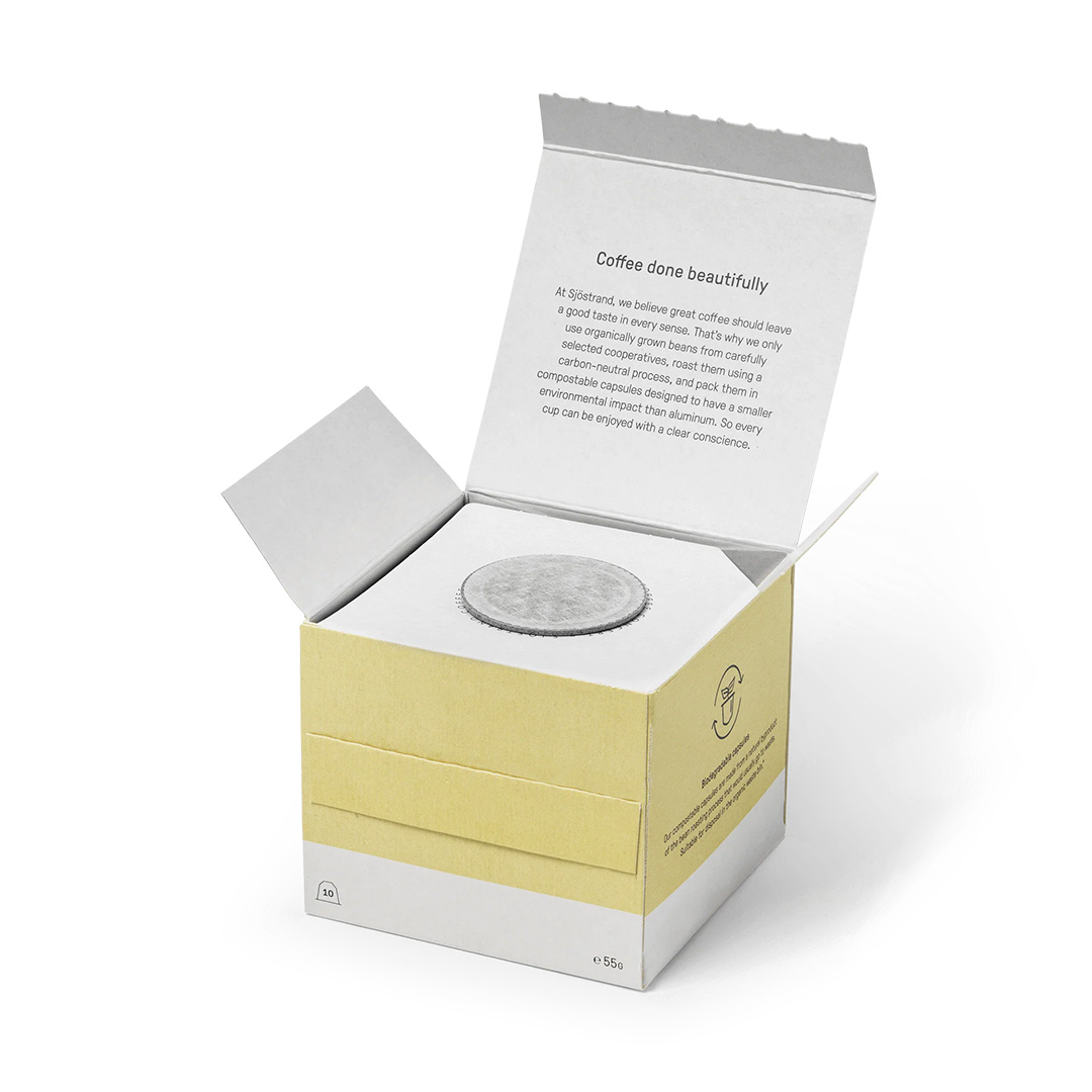 At Sjöstrand, exceptional coffee is designed to be enjoyed responsibly. As part of an ongoing commitment to sustainability, the new biodegradable capsules are created using repurposed coffee waste. Engineered to break down naturally, they deliver the same premium brewing performance without the need for aluminium, plastic, or excess packaging.